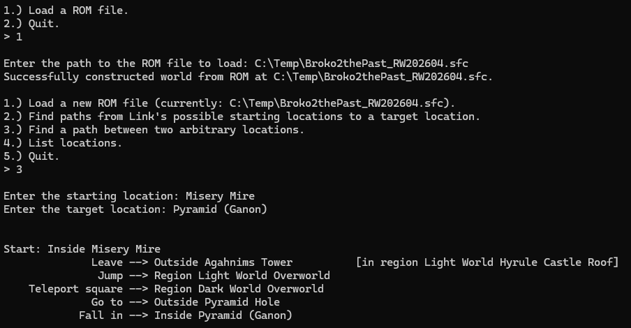 It's a pathfinder for randomized The Legend of Zelda: A Link to the Past games. You give it the path to a ROM (.sfc) file and it tell it where you're trying to go, and it'll give you the path. I actually used it for a dungeon-shuffled game I played in an Archipelago multiworld earlier this month, so it's already paying dividends!